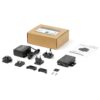 Mounts to a surface or on a DIN rail, with a built-in mounting bracket and included DIN rail clips