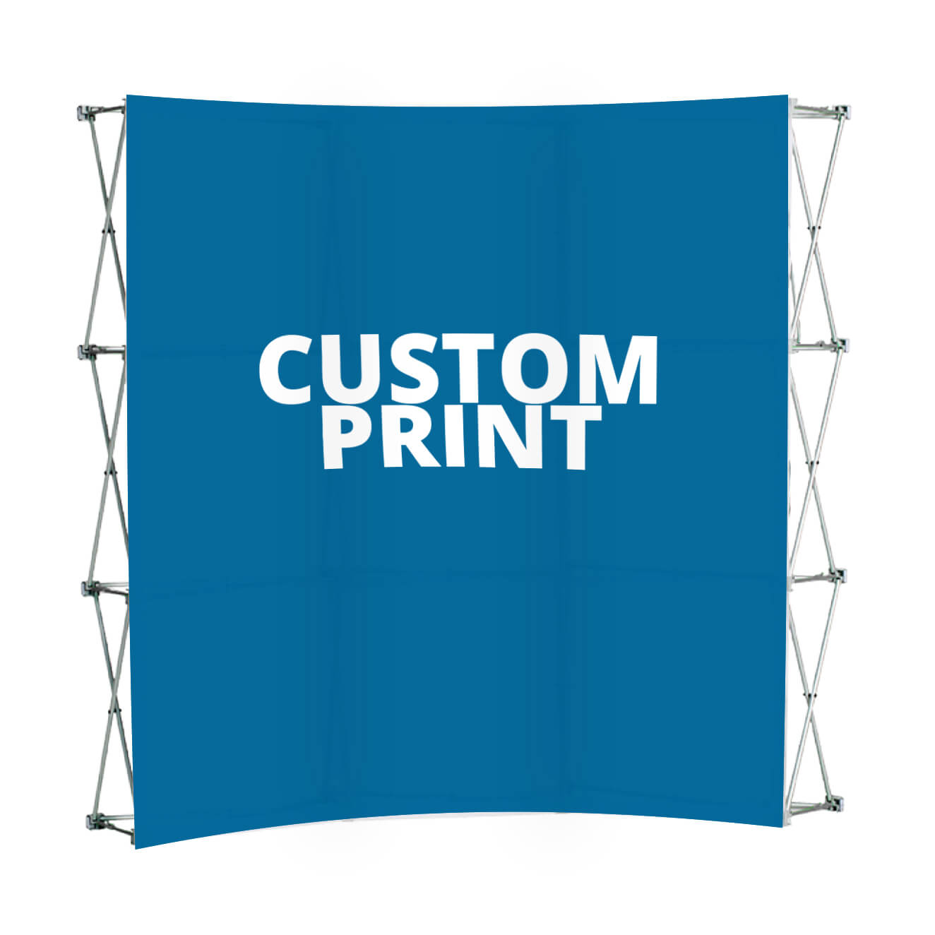 These custom Curved Pop-Up Banners go with our Curved Pop-Up Wall and create a beautiful display. Our beautiful curved banners provide a unique take on our standard pop-up display walls by adding a graceful curve to your custom design. Our banners are printed on durable soft knit poly. Small Custom Banner: Height: 87″, Width: 76.5″, Weight: 3 lbs, Material: Soft Knit Poly